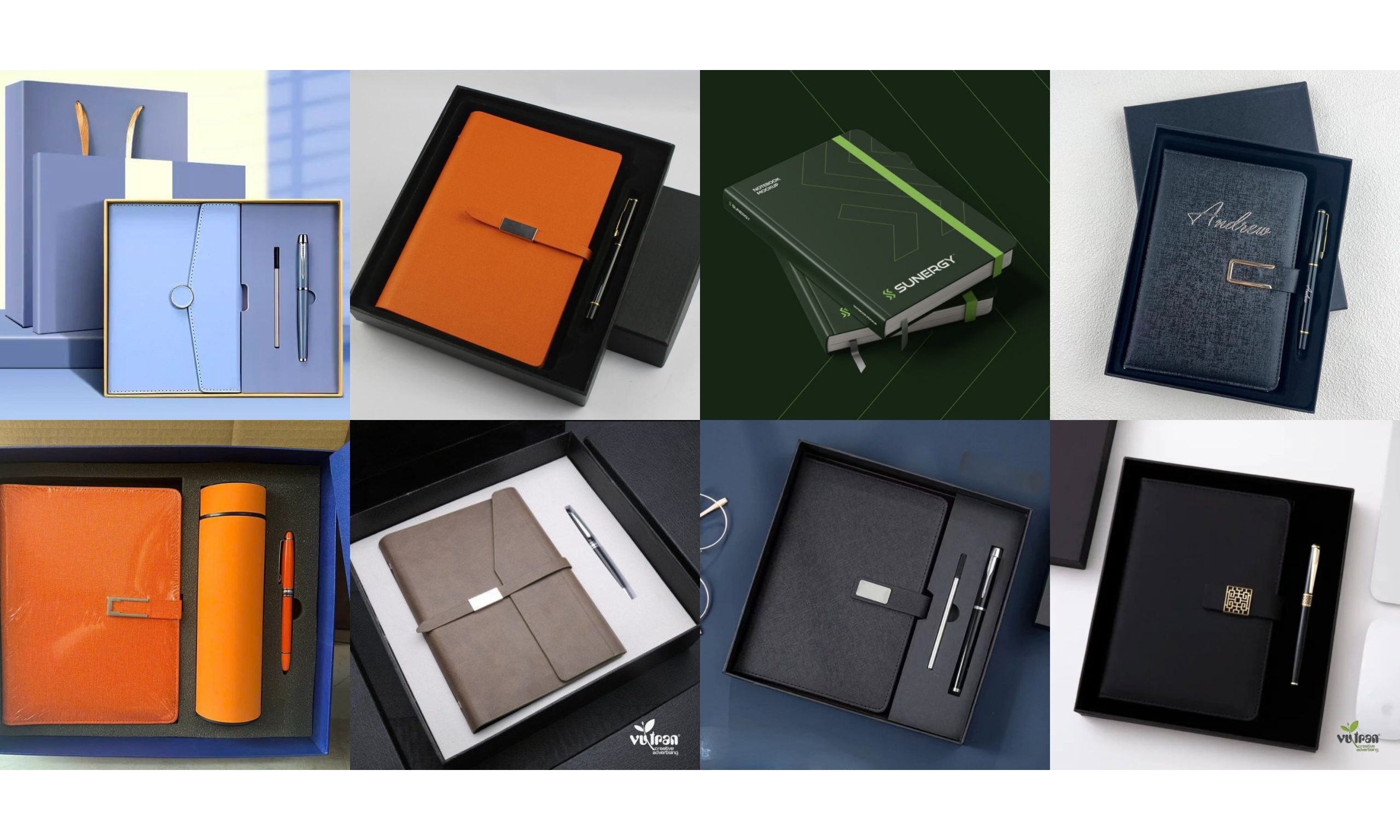 Vũ Trần luôn khuyên khách hàng không nên dùng mẫu sổ đại trà. Sổ tay bìa da dập logo, phối màu chuẩn sẽ tạo đẳng cấp riêng. Khi khách hàng đi họp, sự chuyên nghiệp của công ty bạn sẽ gây ấn tượng mạnh.